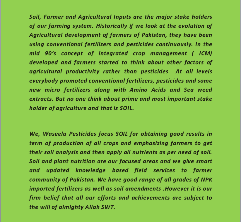 Soil Farmer and Agricultural Inputs are the major stake holders of our farming system. Historically if we look at the evolution of Agricultural development of farmers of Pakistan, they have been using conventional fertilizers and pesticides continuously. In the mid 90's concept of integrated crop management ( ICM) developed and farmers started to think about other factors of agricultural productivity rather than pesticides At all levels everybody promoted conventional fertilizers, pesticides and some new micro fertilizers along with Amino Acids and Sea weed extracts.... Read More